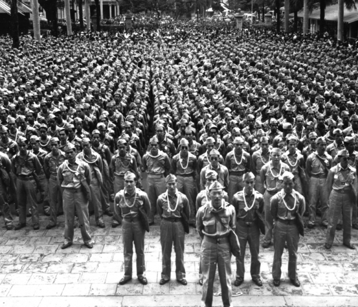 Hundreds of Nisei were in the Army and the Hawaii National Guard and defended against the December 7th attack. On January 5, 1942, all Nisei were labeled “enemy aliens” and the Nisei members of the Hawaii National Guard were ordered back to Schofield Barracks. In May 1942, approximately 1,400 Nisei soldiers were secretly ordered to travel to San Francisco by ship where they were designated the 100th Infantry Battalion.